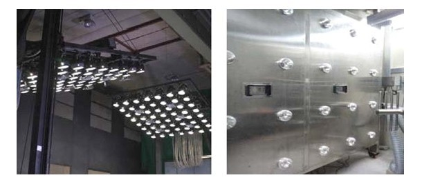 太阳辐射模拟利用连续光谱的太阳模拟灯矩阵模拟,可调节角度及辐射强度,配置可调稳压电源:红外热辐射范围约为 0~1000W/m2。具体调节角度及辐射强度可依据用户要求单独设计。布置形式也依据需求可顶置也可侧置。