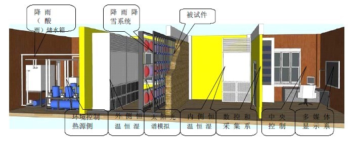 建筑动态环境实验技术是国际建筑技术科学领域的前沿实验技术,是研究建筑材料、构件和系统性能退化及耐久性的关键实验方法,同时还可以开展建筑节能、建筑人居环境等方向的实验研究。大型建筑全环境舱动态实验平台是开展建筑动态环境实验的大型实验系统,代表了该领域先进的实验技术。本实验系统核心技术为多环境参数同步耦合的动态模拟,不同于传统的单一环境参数稳态环境模拟。本系统可模拟动态的温湿度变化、红外太阳辐照、紫外太阳辐射、降雨(酸雨)、降雪、阵风等自然环境条件。
