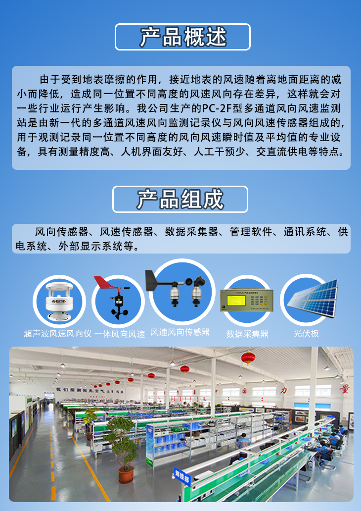 由于受到地表摩擦的作用,接近地表的风速随着离地面距离的减小而降低,造成同一位置不同高度的风速风向存在差异,这样就会对一些行业运行产生影响。我公司生产的PC-2F型多通道风向风速监测站是由新一代的多通道风速风向监测记录仪与风向风速传感器组成的,用于观测记录同一位置不同高度的风向风速瞬时值及平均值的专业设备,具有测量精度高、人机界面友好、人工干预少、交直流供电等特点。