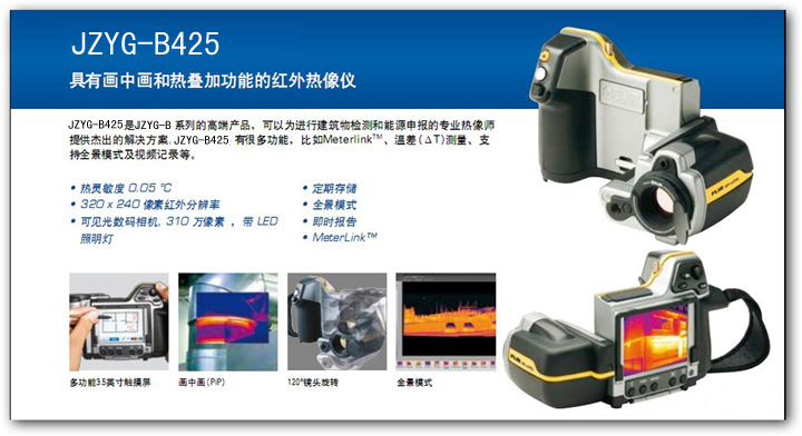 JZYG-B425型红外热像仪是具有画中画和热叠加功能的红外热像仪,可以进行建筑检测和能源申报的专业热像师提供杰出的解决方案。
