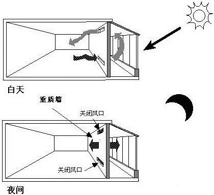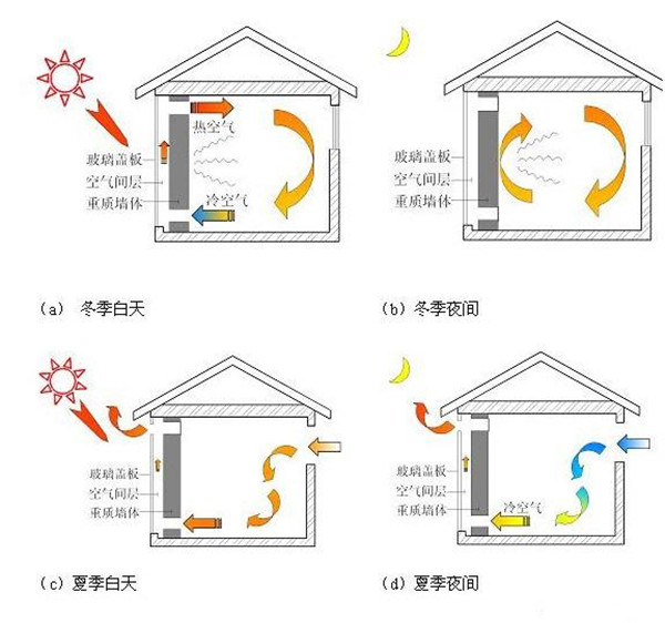 特朗伯集热墙是一种依靠墙体独特的构造设计,无机械动力、无传统能源消耗、仅仅依靠被动式收集太阳能为建筑供暖的集热墙体。它由法国太阳能实验室主任FelixTrombe教授及其合作者首先提出并实验成功的,故通称为Trombewall(特朗伯墙)。特朗伯墙在冬、夏两季以及白天、夜晚的工作运行原理及要求均有所差别。