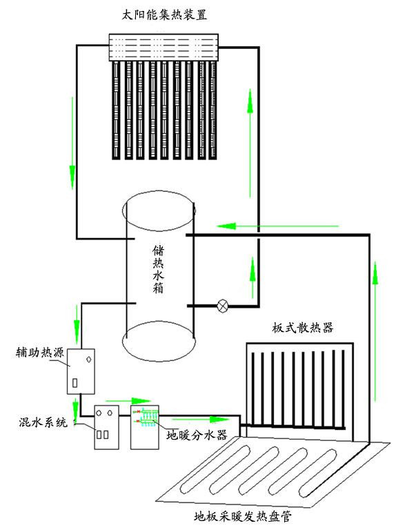 太阳能集热器采集太阳的能量,把冷水逐渐加热,储存在保温水箱内,待需要取暖时开启加以利用,把水箱内储存的热能通过地暖管路内热水的循环对室内空间进行释放热能,将室内的冷空气加热,来提高室内空间的环境温度。满足需要。太阳能采暖系统由太阳能集热器(平板太阳能集热器、真空管太阳能集热器、U型管太阳能集热器、热管太阳能集热器)、水箱、连接管道、控制系统等辅材构成。将分散的太阳能通过集热器,把太阳能转换成热水,将热水储存在水箱内,然后通过热水输送到地暖管路,提供建筑供热的需求。
