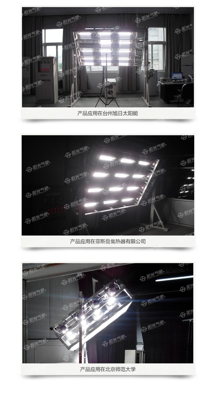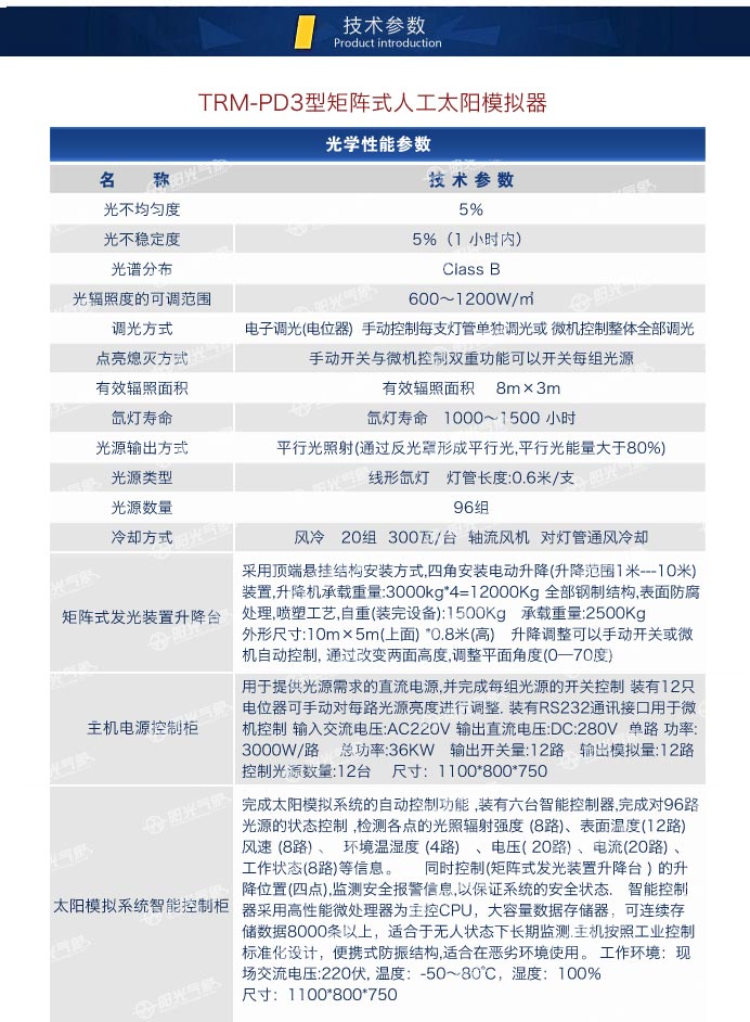 TRM-PD3型矩阵式人工太阳模拟器(面积定制)是锦州阳光科技发展有限公司根据多年太阳模拟器生产经验开发的矩阵式模拟光源(称人造太阳),专用于太阳能产品室内测试的实验设备。TRM-PD3人工太阳模拟器具有操作简单、使用方便,安全可靠的特点。