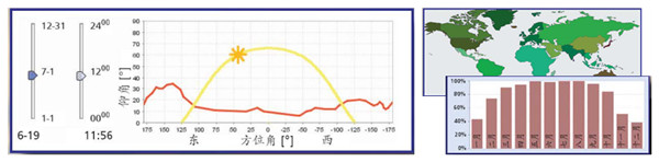 (6)可以针对不同的建筑、不同时间段进行模拟计算软件中采用动态建筑模拟,考虑到建筑所有相关的参数,包括几何结构、方位和热质,提供详细的隔热数据;同时软件在计算中,由定位坐标和地平线共同确定太阳的位置,每四分钟更新一次,因此甚至可以专门针对某小时、某天或者某段时期内的太阳能系统进行模拟计算。