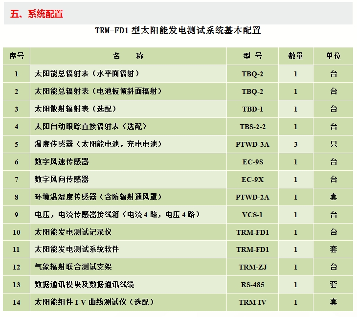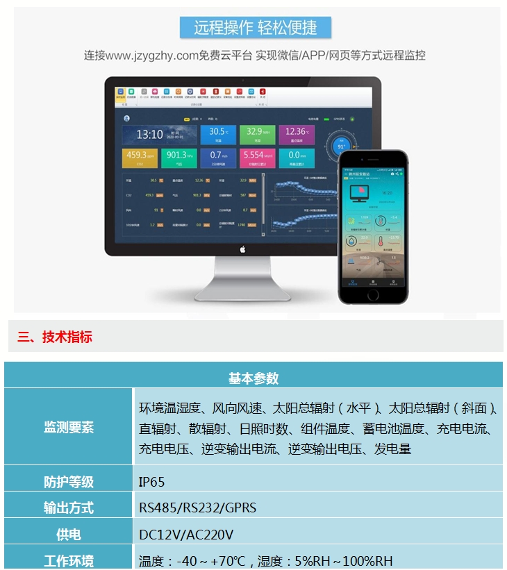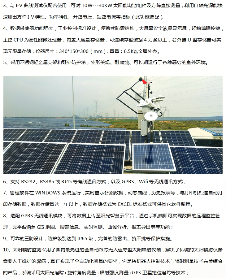 TRM-FD1型太阳能发电测试系统,可实时在线监测光伏电站现场的气象环境数据、发电量、电压电流等,这些监测数据是决定太阳能发电的重要指标,对太阳能发电质量起着决定性作用,同时也是对光伏电站的设计提供有效的数据保证。