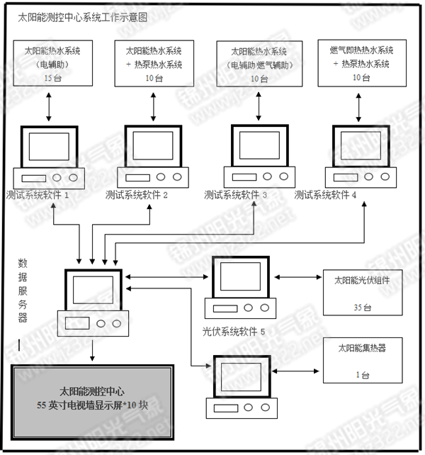 太阳能实验室测控中心集成了现代化的网络技术,集显示、监控、操作、测试于一体的综合型应用平台。该平台可为太阳能光热、光伏等检测设备提供远程终端服务及操作,使用方便,技术先进,信息集成化程度高。测控中心采用C/S拓补结构设计布置,并提供B/S模式服务,以及测试现场录像监控,室内采用40-55寸显示幕墙,用以显示测试现场的数据及相关图像,并可同时设置多台7寸以上显示屏数据处理终端,可供实验室远程监督管理使用。