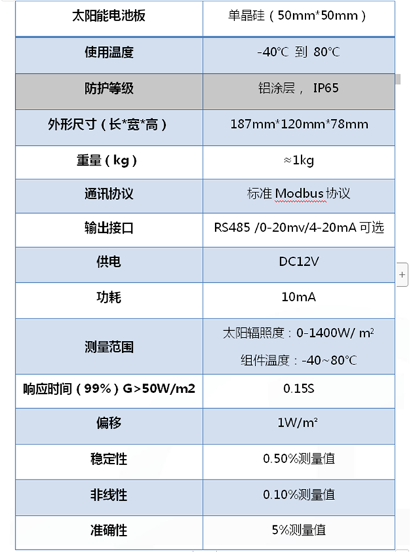 硅基太阳能电池,能够作为辐照度传感器,是因为其短路电流与辐照度成正比。我们的传感器使用的单晶硅太阳能电池并联。由于并联的低电阻, 运行时电流与短路电流几乎相同。为了最小化温度对测量信号的影响,增加了温度传感器来补偿数据,传感器安装在电池板的后面,检测值可近似等同于组件温度。
