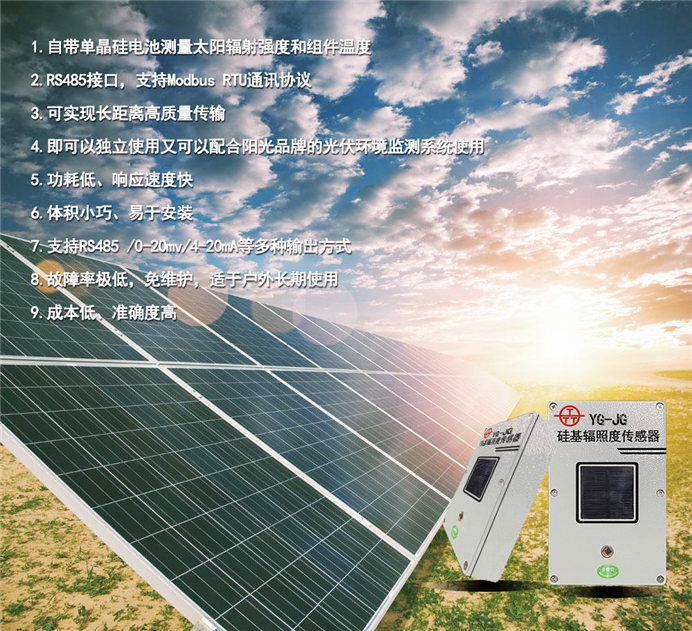 硅基辐照度传感器是锦州阳光气象科技有限公司根据太阳能电池板的特性,专门为光伏发电行业研制的一款低成本、高可靠性的太阳辐照度测量传感器。其传感器的本身,采用硅基结构与光伏板的结构及其相似,是一个十分理想的参照系统。特别是它的光谱响应以及倾斜误差都与光伏板极其相似,这让使用硅基传感器来精准的分析光伏板辐照度数据,有据可循。