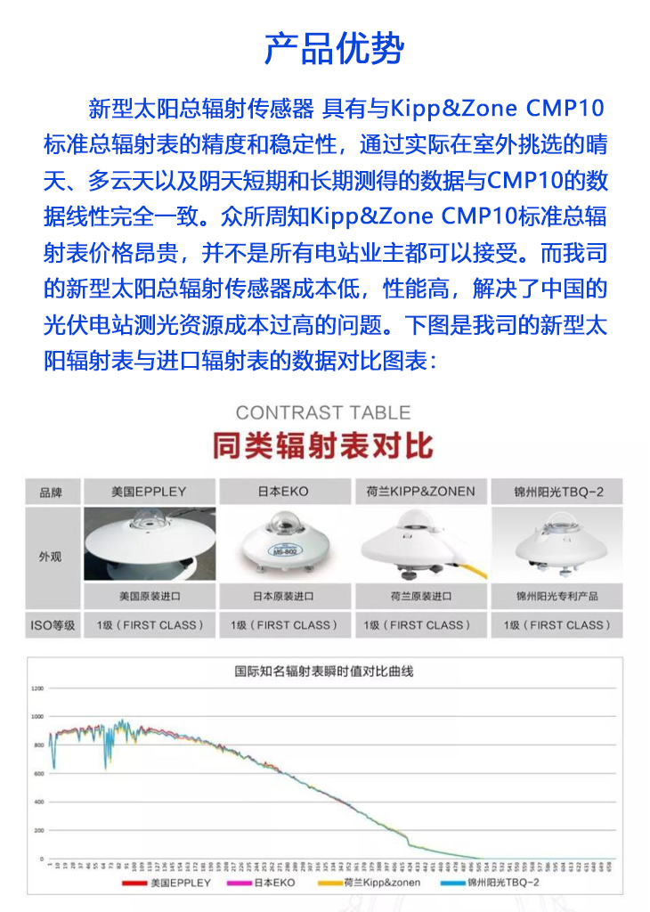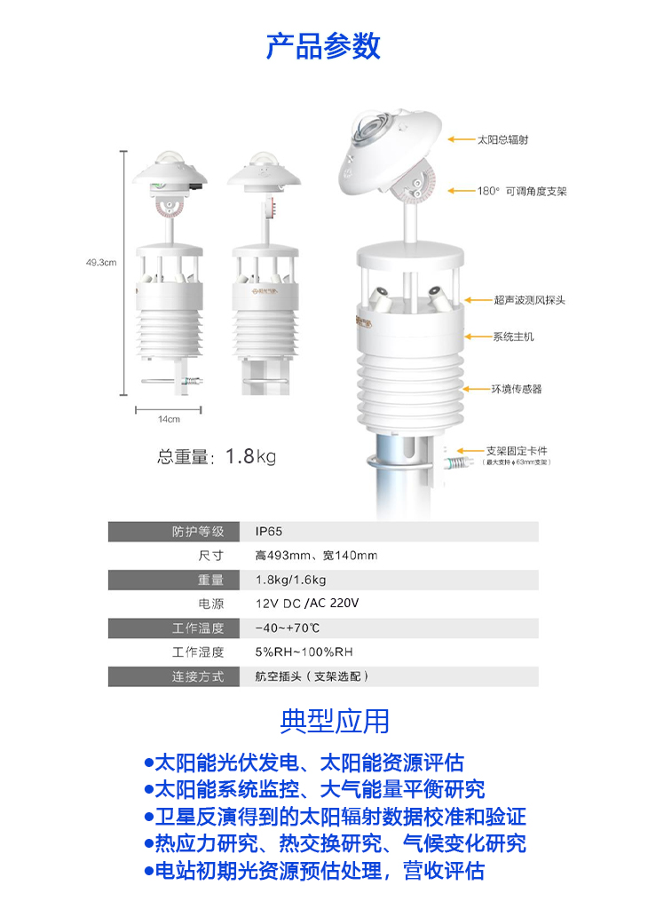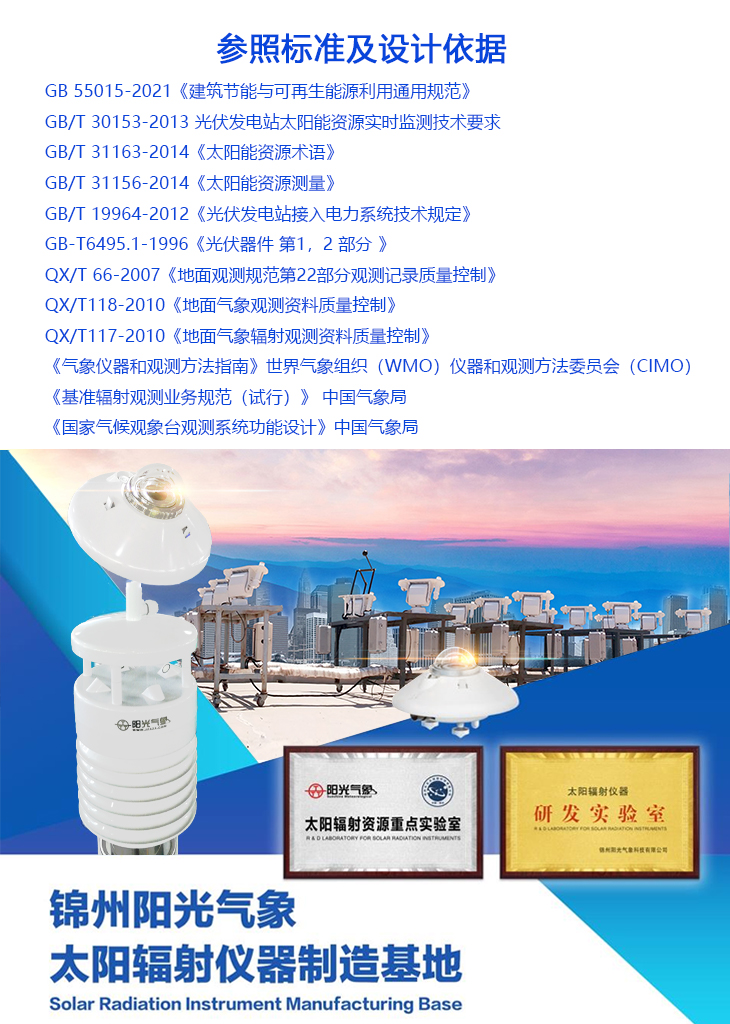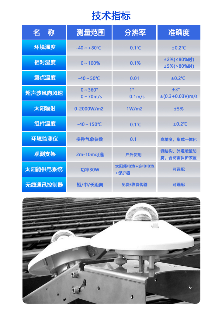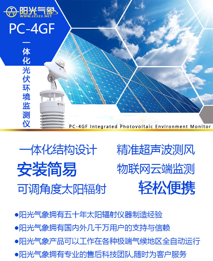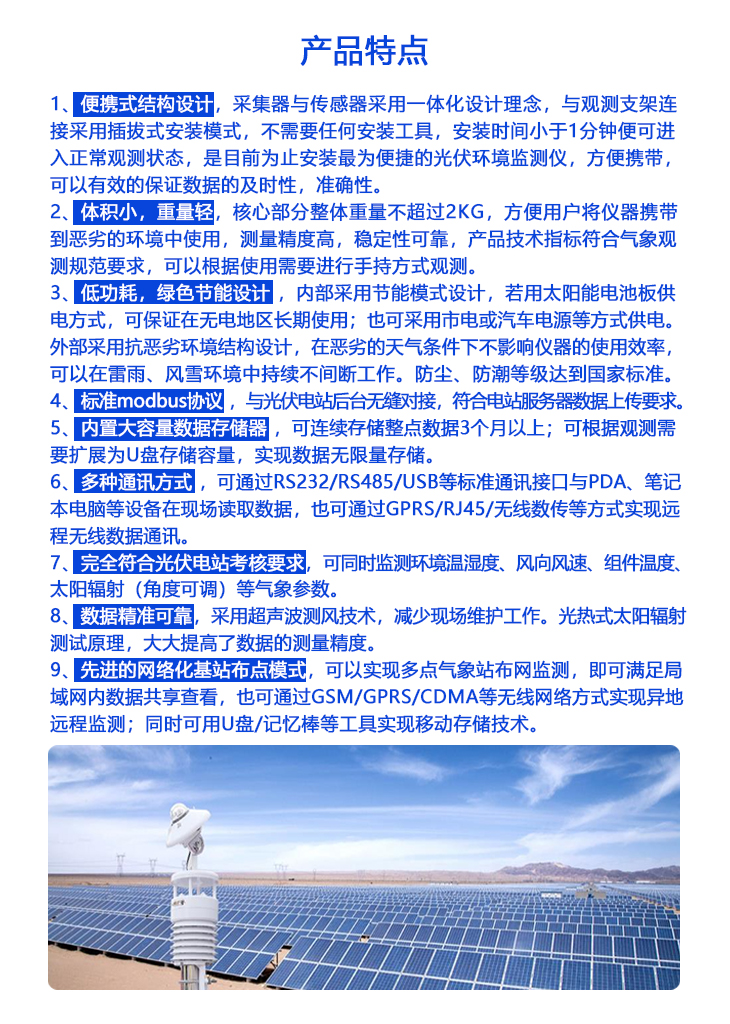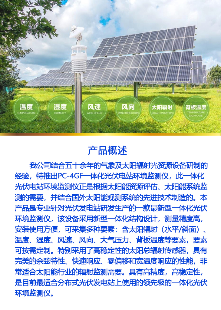 本产品是针对光伏发电站研发生产的一款最新型一体化光伏环境监测仪,该设备采用新型一体化结构设计,测量精度高,安装使用方便,可采集多种要素:含太阳辐射(水平/斜面)、温度、湿度、风速、风向、大气压力、背板温度等要素,要素可按需定制。