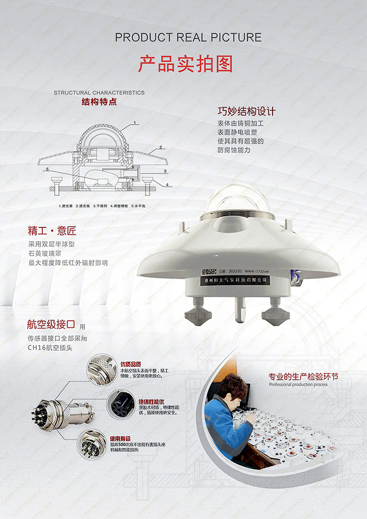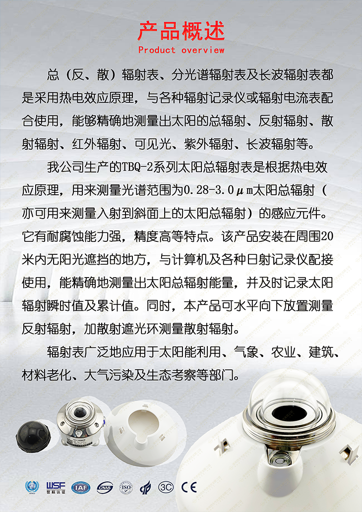 我公司生产的TBQ-2太阳总辐射表是根据热电效应原理,用来测量光谱范围为0.28-3.0μm太阳总辐射(亦可用来测量入射到斜面上的太阳总辐射)的感应元件。它有耐腐蚀能力强,精度高等特点。