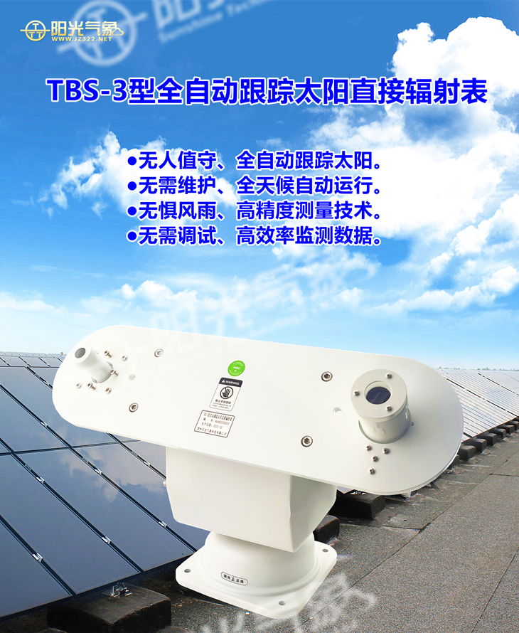 TBS-3全自动跟踪太阳直接辐射表是国内的无人值守太阳直接辐射表。它人性化的设计理念,使人们对太阳直接辐射的测量不再繁琐。无需每天的调试,无需不停的维护,你只需要将它安装在测试场地,就可以精确的测量到每天不同时刻的太阳直接辐射值。