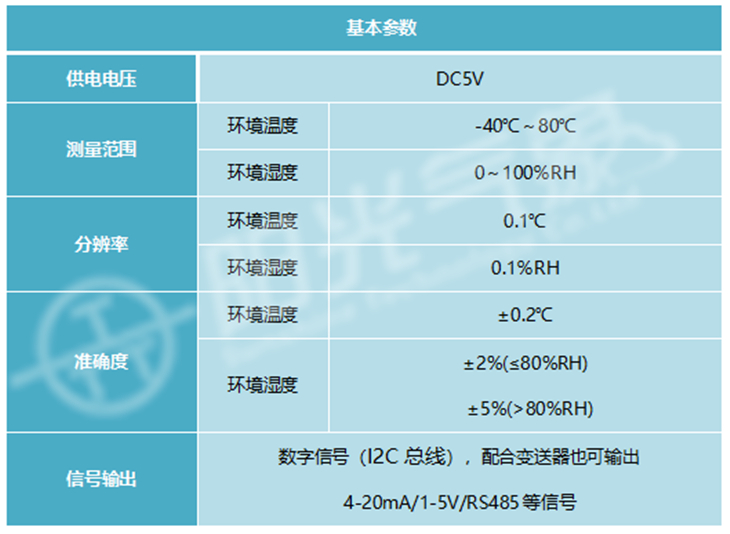 4、数字信号输出,I2C总线与微控制器进行通信,能输出数字式温湿度数据。