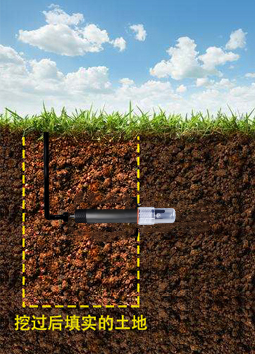 垂直挖直径>20cm的坑,按照测量需要,在既定的深度将传感器水平插入坑壁,将坑填埋严实,稳定一段时间后,即可进行连续数天,数月乃至更长时间的测量和记录。