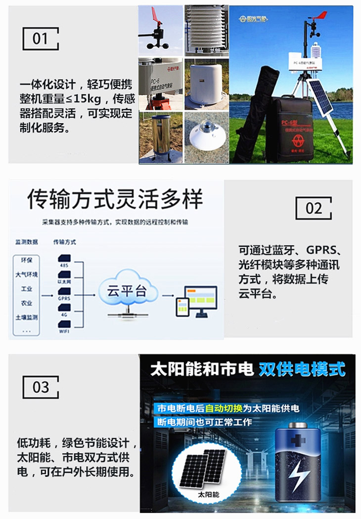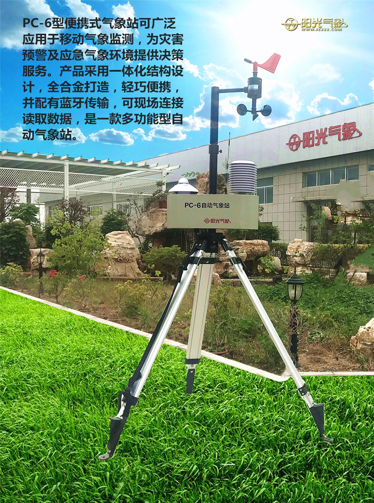 PC-6型便携式阳光气象站是非常便捷的气象观测站,核心监测部分整体重量不超过5KG,高度集成,体积小巧,携带方便,是一款性价比突出的小型自动气象站。