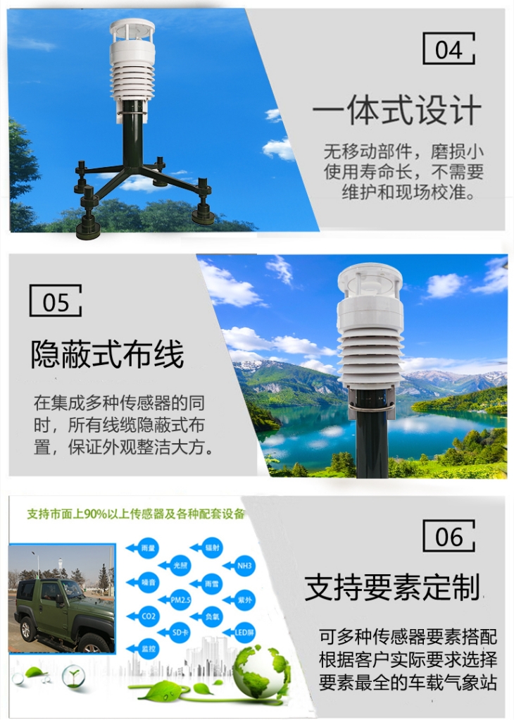 PC-4A车载气象站是在结构设计和观测要素方面专门为移动应急环境而设计的一款综合观测自动气象站。它可以监测风向风速、空气温湿度、降雨、气压、噪声、太阳辐射等气象要素,也可以测量PM2.5、PM10、CO、NO2、SO2、O3等气体和颗粒物指标。