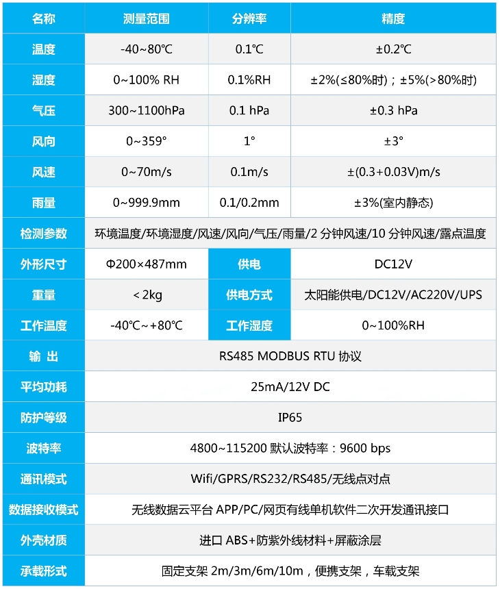 PC-8K气象六参数环境监测仪是我公司自主研制的一款测量多种气象要素的专业级一体化气象站,可同时测量大气温度、大气湿度、风速、风向、气压、雨量等主要气象要素。其中雨量为高精度翻斗式雨量传感器,其特点是精度高,响应速度快,串口输出,方便用户直接通过PC或外接仪器进行采集。