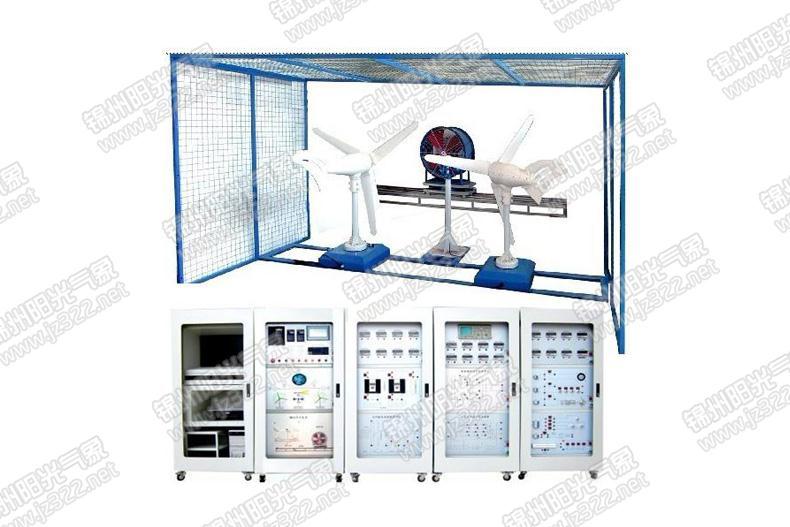 本系统由模拟风系统、模拟风控制系统、离网逆变系统、充电控制系统、负载系统和风能控制系统组成;其中有2个被控对象和5个控制柜组成。模拟风力发电系统用4000w的鼓风机模拟自然风,其风力大小可以通过变频器控制鼓风机转速来完成,PLC采用PWM模式对直流减速电机进行调速控制;鼓风机在交流电动机的驱动下左右移动,左右旋转以改变风吹方向,以模拟不同风速风向下的发电效果风力风向检测装置检测风力大小及方向;发电风车实时跟踪发电。发电风车还配有叶片转速检测装置,在计算机上实时显示其运转状况及相应参数。