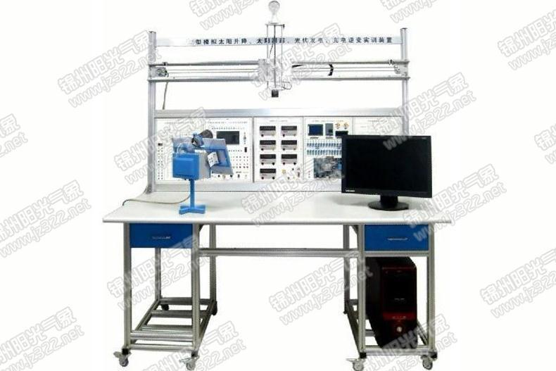 YG-JXST04型小型模拟太阳升降、太阳跟踪、光伏发电、充电逆变实训装置用200W节能灯模拟太阳,模拟太阳可以左右移动1180mm,上下620mm到810mm米之间,模拟太阳的弧线升降的全过程,而且模拟太阳升降的时间可以根据实验需要来改变的新能源教学设备。太阳跟踪系统对模拟太阳的移动进行跟踪,太阳跟踪系统上的光伏发电装置在模拟太阳光下发电,并对蓄电池进行充电,逆变装置对蓄电池的直流电进行逆变,产生220V交流电,并给负载供电。