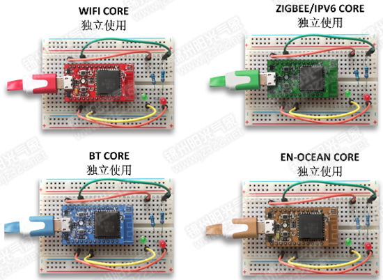 传统实验箱只包含一种ZIGBEE 无线组网,YG-IOTV3引入多种国际主流无线传感网技术,除了包含ZIGBEE 无线组网,还包含蓝牙无线组网,WIFI 无线组网和EN-OCEAN无线组网。并且每个无线通信模块可以独立运行。