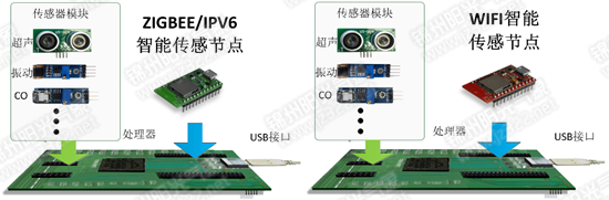 每个节点基于"传感器+处理器"的架构,可以独立运行,配合20 多种传感器??椋阄锪ㄒ?quot;智能传感器"相关课程的教学实验。