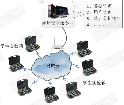 为了方便教师管理,不同学生组网设备可以互联,把每个节点、每个实验箱的实验数据存储、显示到教室的教师服务器上,实现对学生实验过程的数据管理、用户管理及基于这些数据形成统计分析报告。