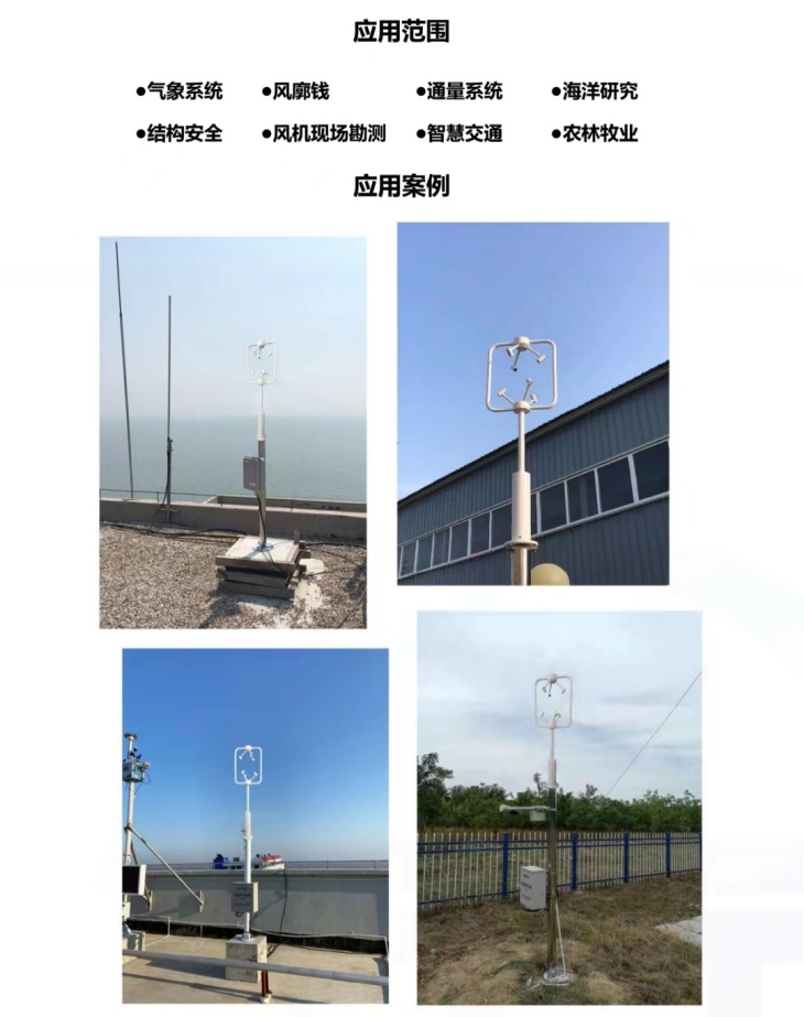 EC-A6型三维超声波风速风向传感器采用先进的超声波测量技术,独特的两根支撑杆结构设计,大大减小了风阻的影响,提升了测量的精度。它具有全金属材质,没有任何移动部件,坚固耐用的特点,可以同时测量水平和垂直方向的风向, X/Y/Z轴风速(即U、V、W矢量输出),声温、声速等参数。适应在各种环境下,全天候、长久的正常工作,为各领域的气象监测提供可靠数据。三维超声波风向风速传感器用来测量近地风向、风速。广泛应用于城市环境监测、风力发电、气象监测、桥梁隧道、航海船舶、航空机场等领域。