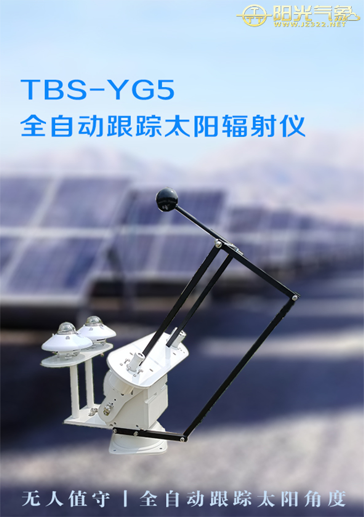TBS-YG5全自动跟踪太阳辐射仪是目前最先进的无人值守型太阳辐射仪器,解决了国内太阳辐射仪器需人工维护的弊病(特别是直接辐射与散射辐射),满足了全自动化测量的要求,它是将机器人控制技术与辐射仪器完美结合的产品, 系统采用光追踪+旋转角度测量+光照强度测量+跟踪运行等综合技术, 可保证高精度的跟踪太阳。 同时测试太阳的五要素指标(总辐射,散射辐射,直接辐射,日照时间,太阳高度角),还具有强大的网络通讯功能,测试数据可以远程传输到指定的服务器??捎τ糜谄蟆⑻裟?、光伏、农业、建筑及科研教学等领域。