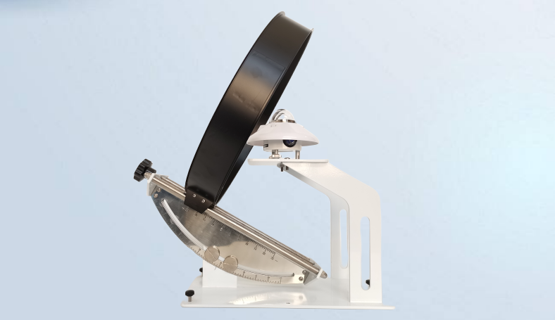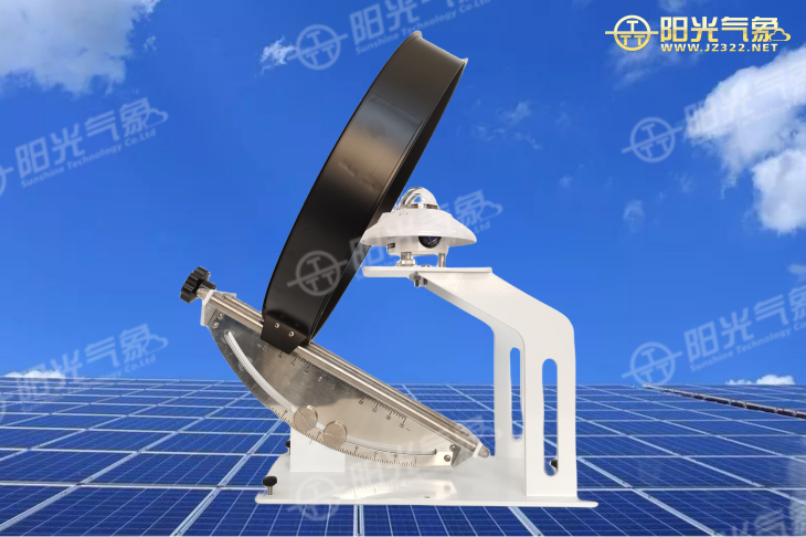 本装置设有宽度为65mm,直径为400mm的遮光环圈,固定在刻有纬度刻度与赤纬刻度标尺的丝杆调整螺旋上。标尺与支架固定在底盘上,根据架射地点的地理纬度而固定。总辐射表安装在支架平台上,其高度应正好使辐射感应平面(黑体)位于遮光环中心。通过调节赤纬度,可使遮光环全天遮住太阳的直接辐射。