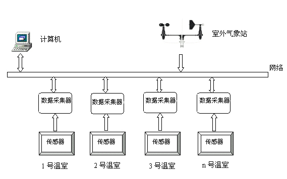 光温室集群监控系统包括:计算机、打印机、数据采集器、温室用传感器(温度、湿度、光照等)、监控软件。