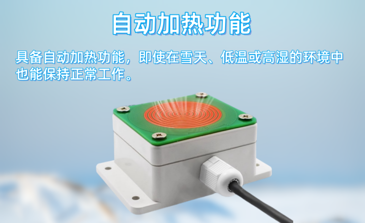 4、具备自动加热功能,适用于降雪检测,在长时间低于0度的环境及高湿度条件下,有效防止冰冻和结露现象。
