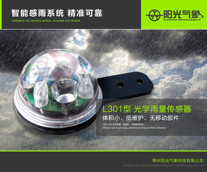 L301型光学雨量传感器是锦州阳光研发的新型光学雨量传感器,使用光束的红外光检测触及外表面的雨滴,它比一个典型的翻斗式雨量计要灵敏100倍,并单个计数雨滴,发送脉冲信号。