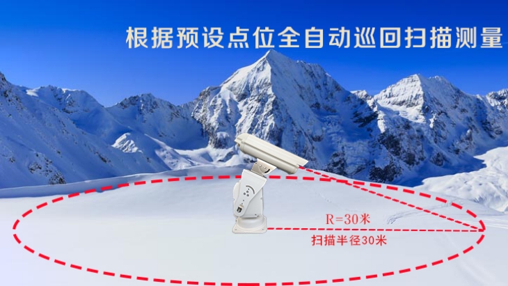 1、扫描式雪深测量仪具有测量点可灵活设定的功能,最多可测量180个点位,仪器按照设定点位自动轮询测量,不需人工参与,同时雪深报警值也可根据用户需求进行任意设置;