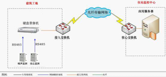 客户需要在八个施工点实现远程的噪声、粉尘参数的监测预警,然后通过终端传输设备接入到Internet网络。共八个施工点需要同时监测,全部接入到服务器机房,客户端采用web网页方式实施管理和查询。达到实时监控与指挥的目的。